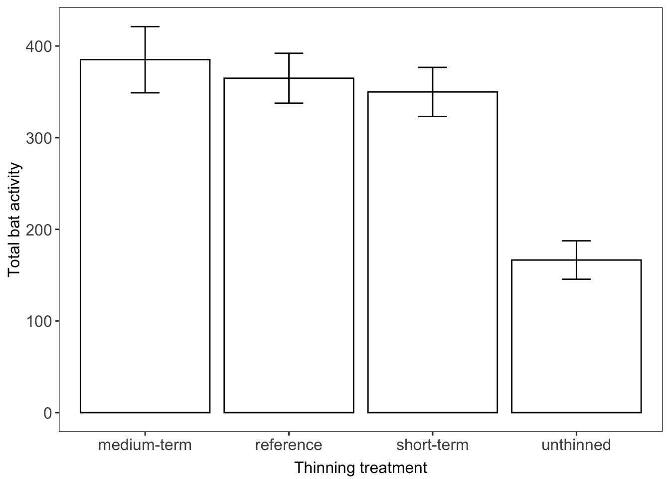 Written If we were writing a paper about bat activity across different forest thinning treatments, we could use our summarised data to make some broad observations at the beginning of our results section, prior to further analysis. For example: “Bats were twice as active in in mature open (reference) forest (365 ? 27) compared to unthinned regrowth (166 ? 21) (mean ? SE). However bat activity was similar across medium-term (385 ? 36) and short-term (350 ? 27) thinned and reference forests”.