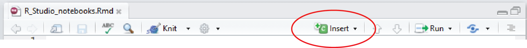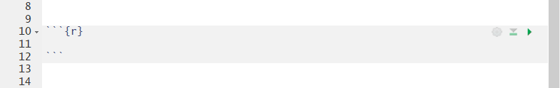 Executable code is added to your notebook in what are called chunks. To do this, click on Insert, R from the top right of your notebook (or use Ctrl + Alt + I on the keyboard). This will add an empty chunk that looks like this: