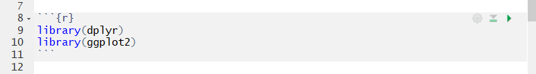 Any code that you want to run then be added inside the chunk. I like to use the first chunk in the notebook to load any R packages that might be required for the upcoming work. E.g.,