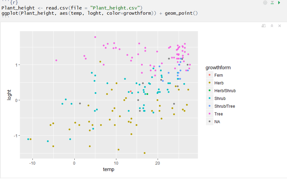 Output from your code will appear directly below the code chunk rather than in the console below or the plots pane to the right. For example, a plot of plant height vs temperature from the data set used in our linear regression tutorial.