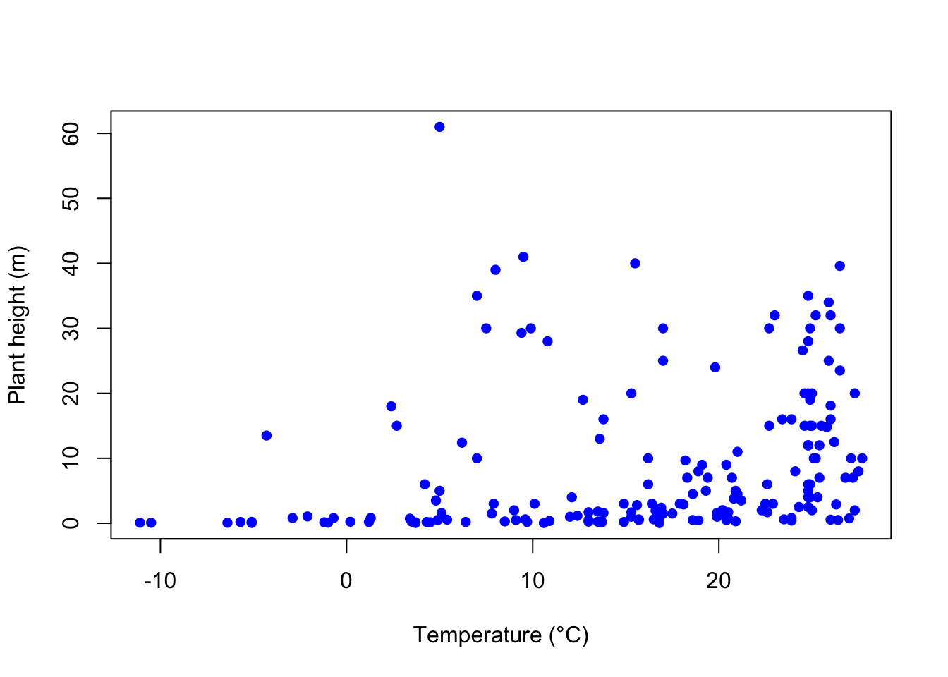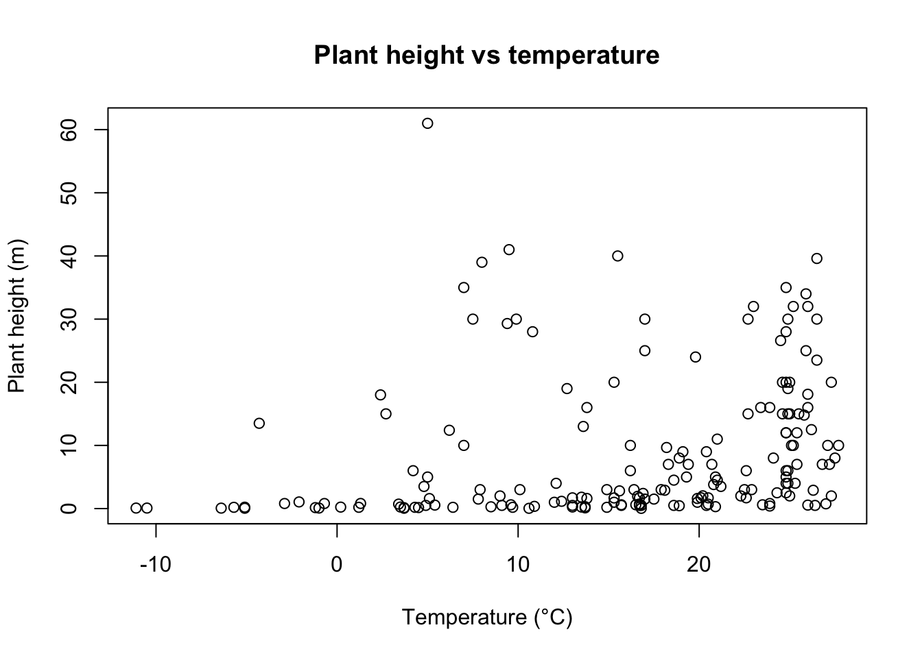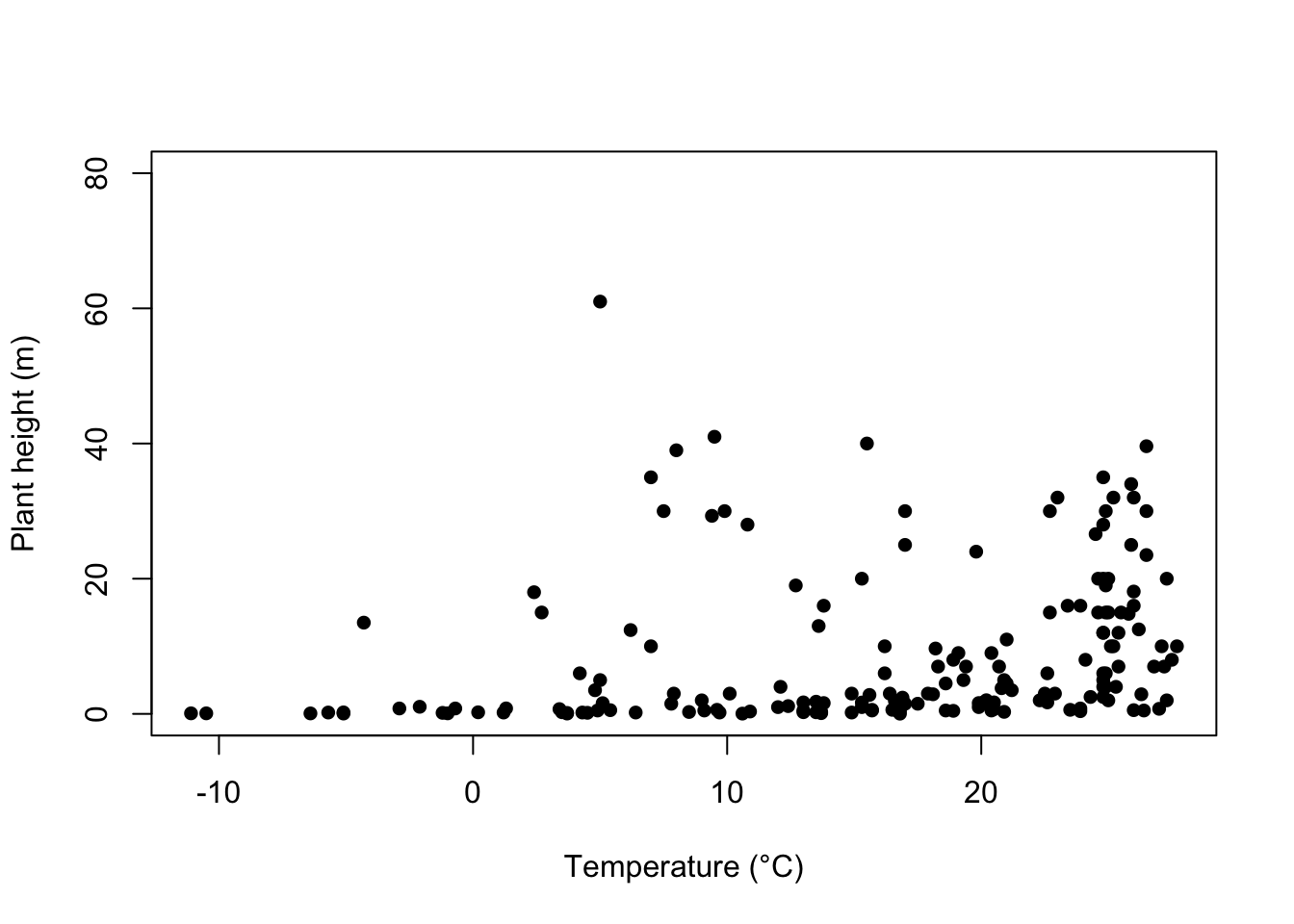 plot(height ~ temp, data = Plant_height, xlab = "Temperature (°C)", ylab = "Plant height (m)", ylim = c(0, 80), xlim = c(-20, 30))