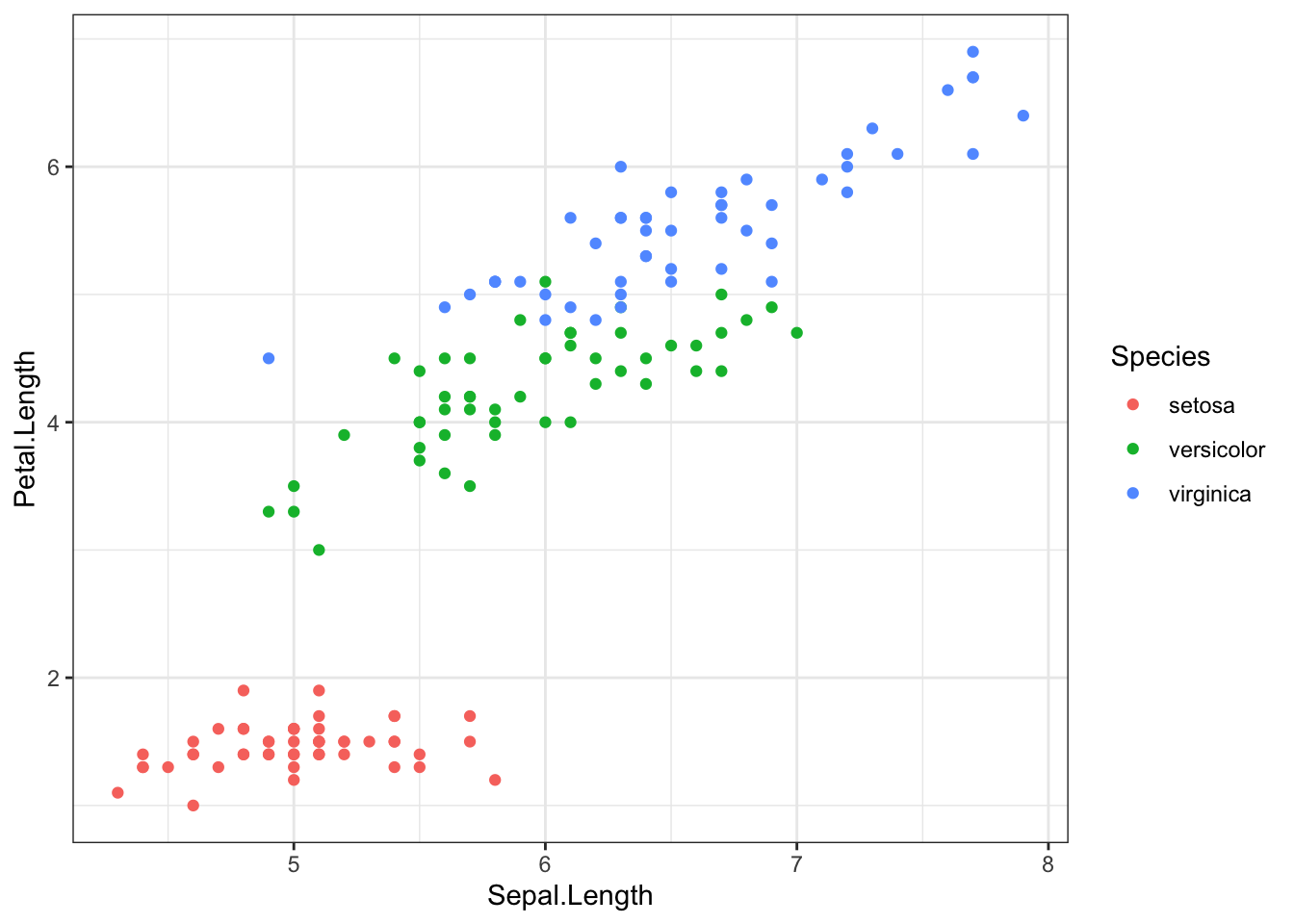 plot5 <- ggplot(iris, aes(Sepal.Length, Petal.Length, colour = Species)) +
