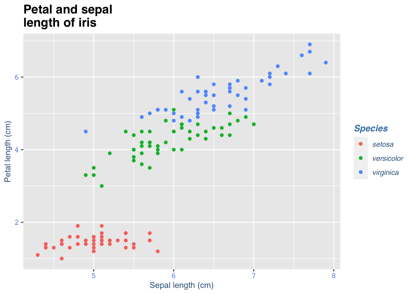 print(IrisPlot + mynamestheme + labs(title = "Petal and sepal \nlength of iris", y = "Petal length (cm)", x = "Sepal length (cm)"))