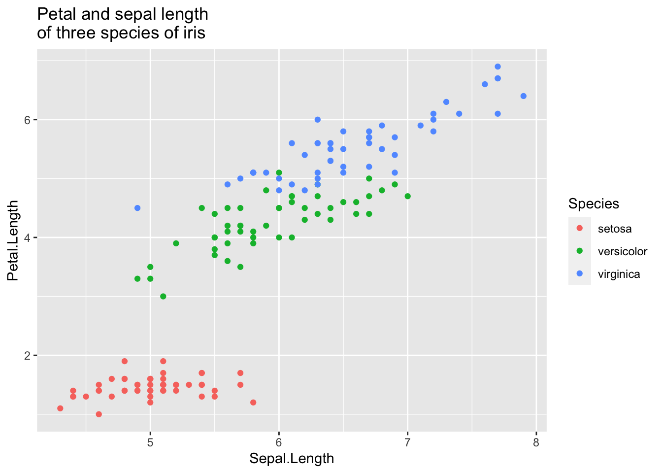 print(IrisPlot + ggtitle("Petal and sepal length \nof three species of iris"))