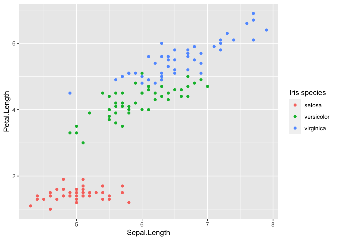 IrisPlot <- ggplot(iris, aes(Sepal.Length, Petal.Length, colour = Species)) +