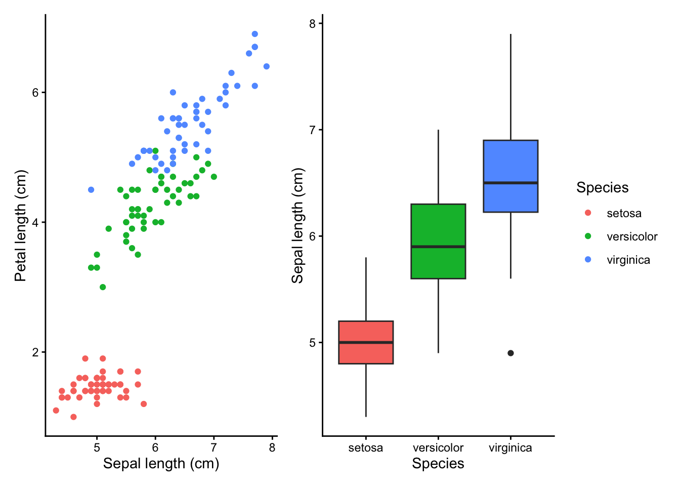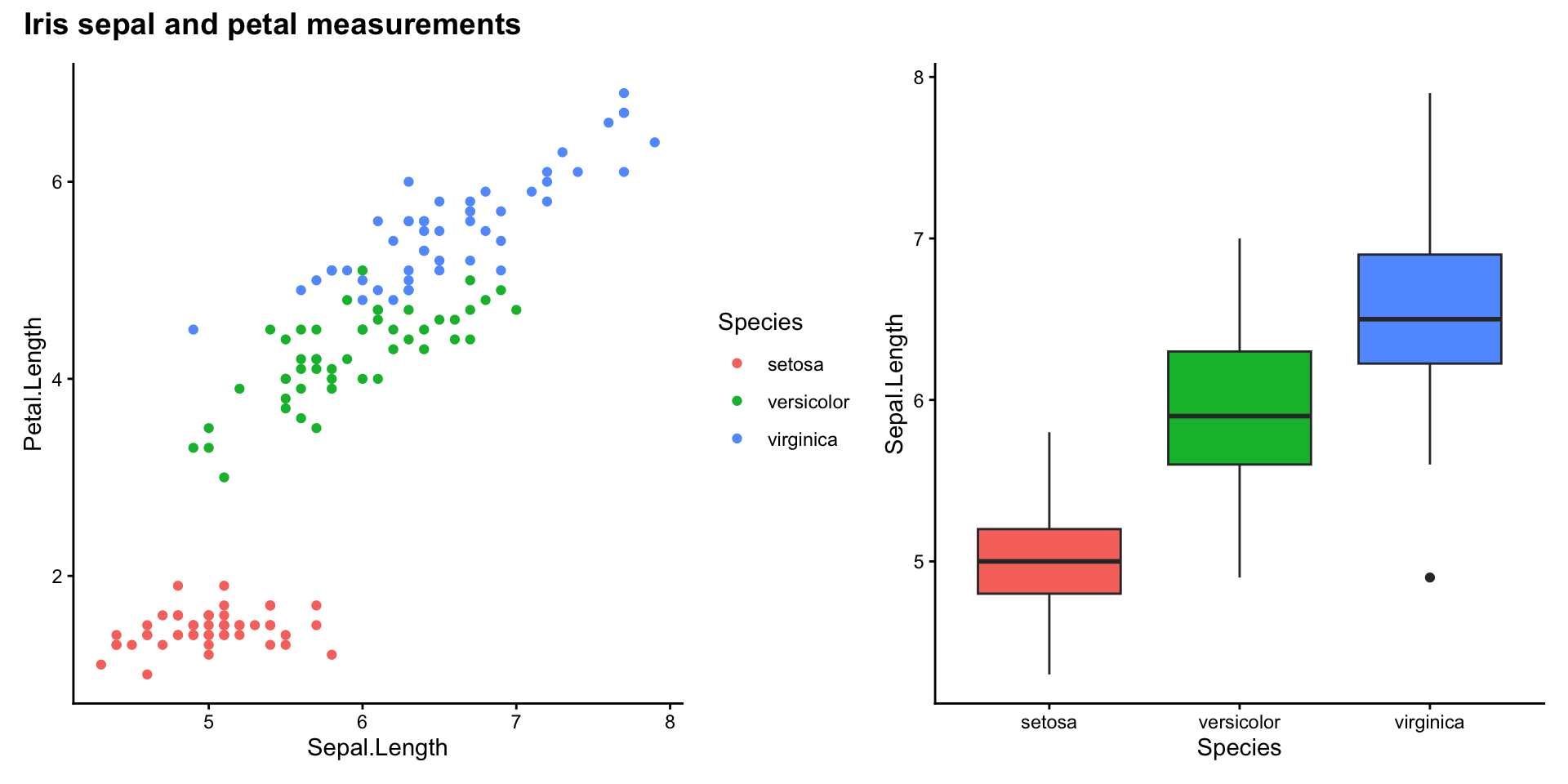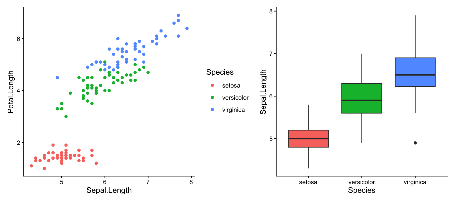 p2 <- ggplot(iris, aes(Species, Sepal.Length, fill = Species)) +