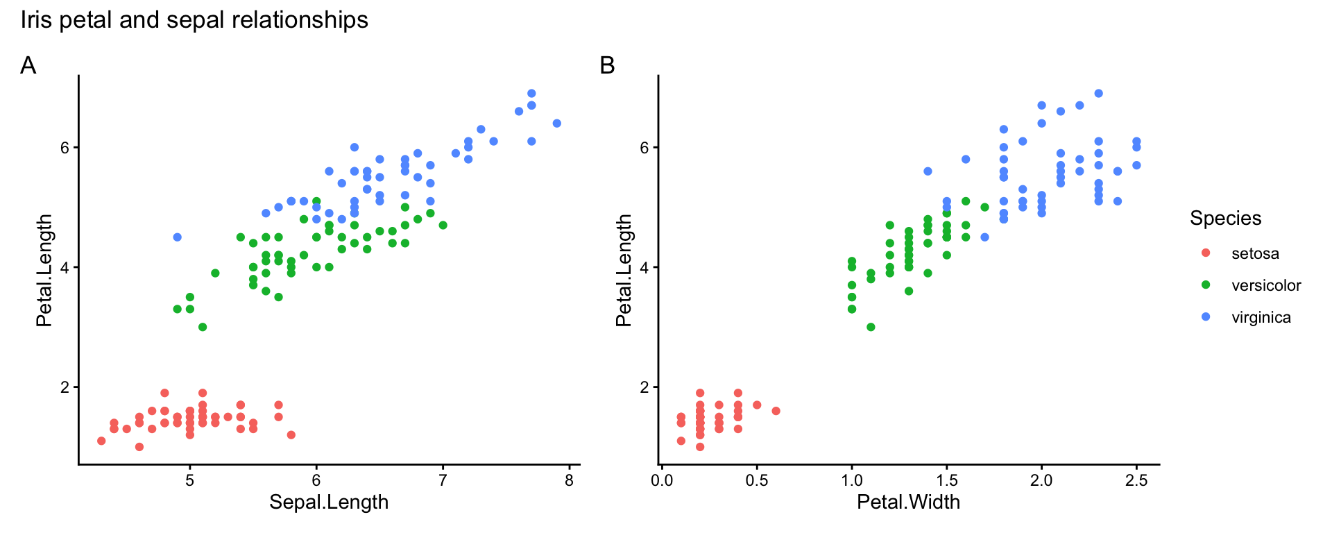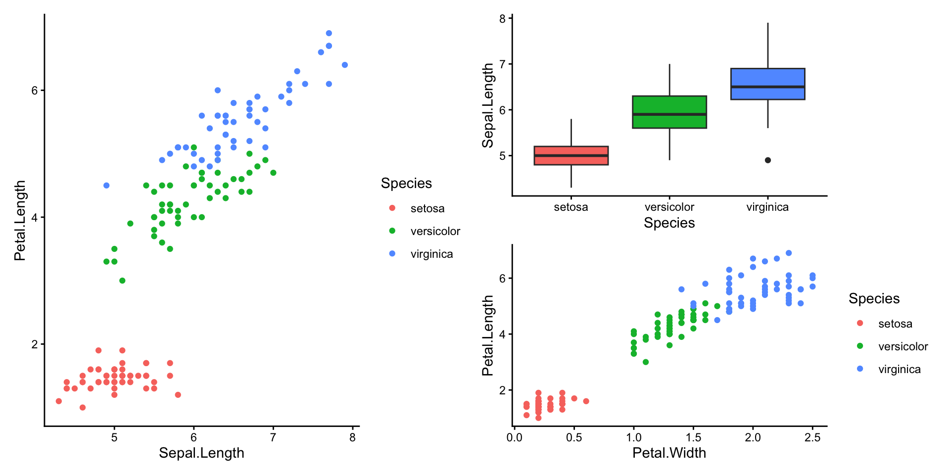 p3 <- ggplot(iris, aes(Petal.Width, Petal.Length, colour = Species)) +