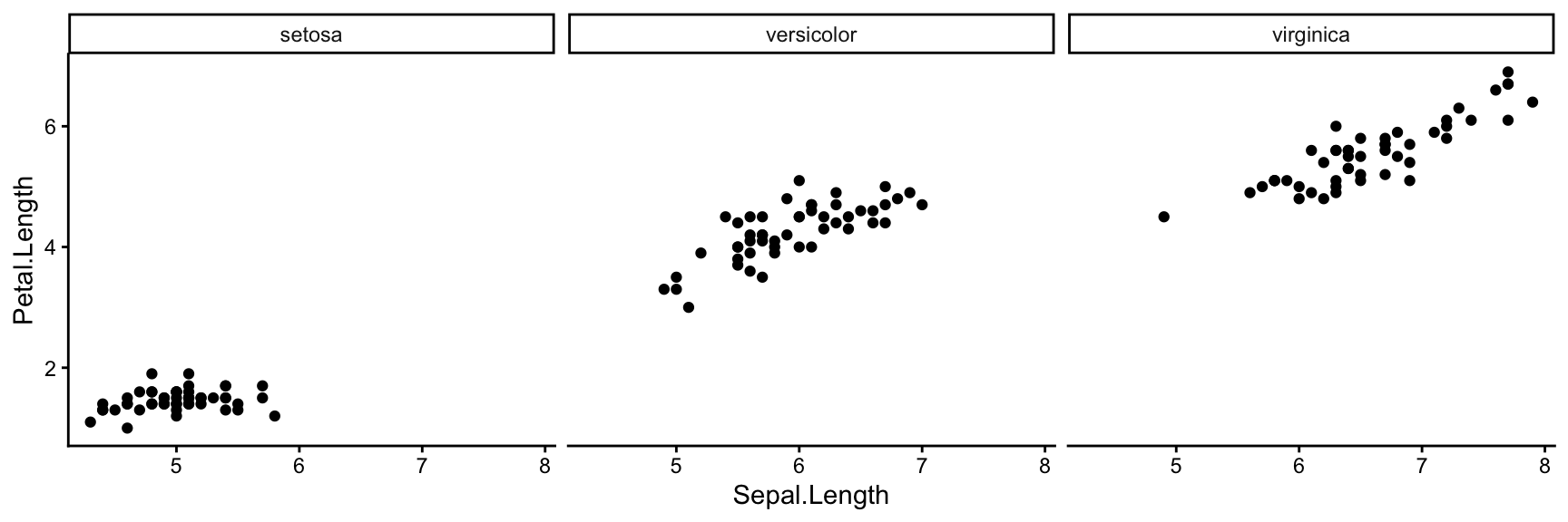 The formula syntax ~ variable specifies which variable to split on. For example, to make a separate scatter plot for each iris species: