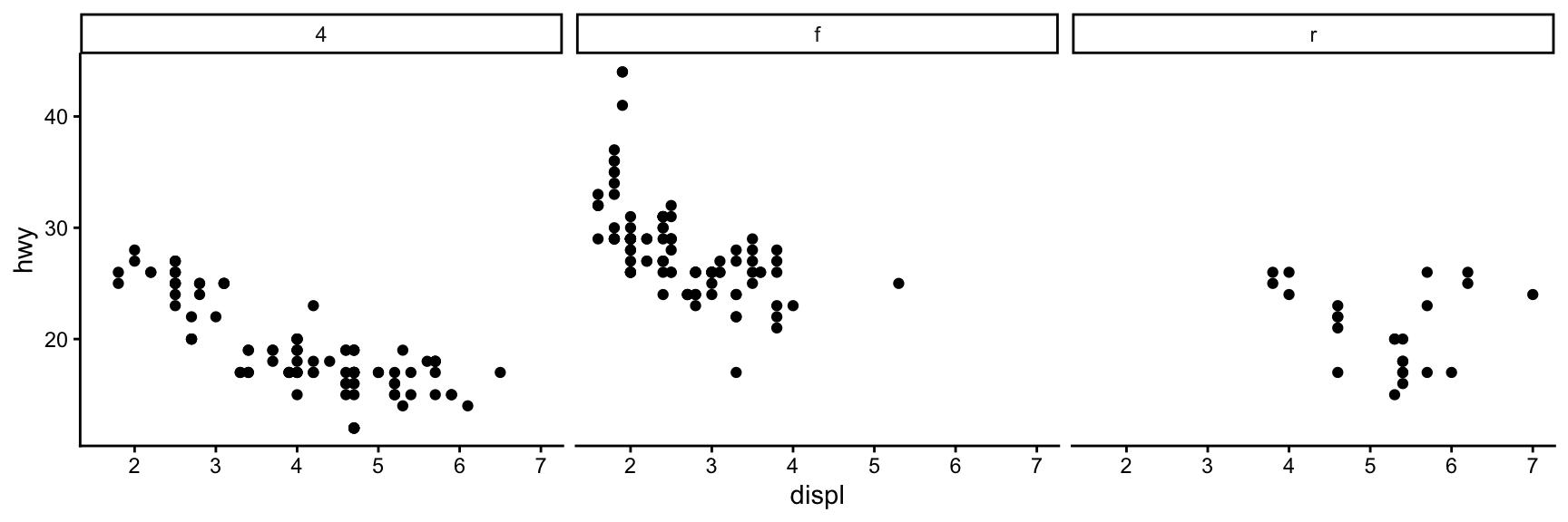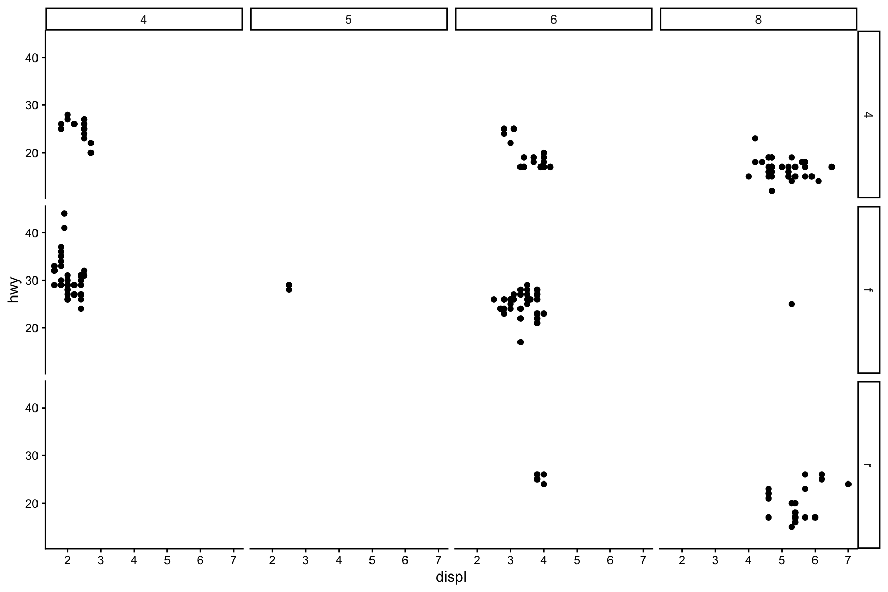 Here we use the mpg dataset, splitting by drive type (drv) in rows and number of cylinders (cyl) in columns:
