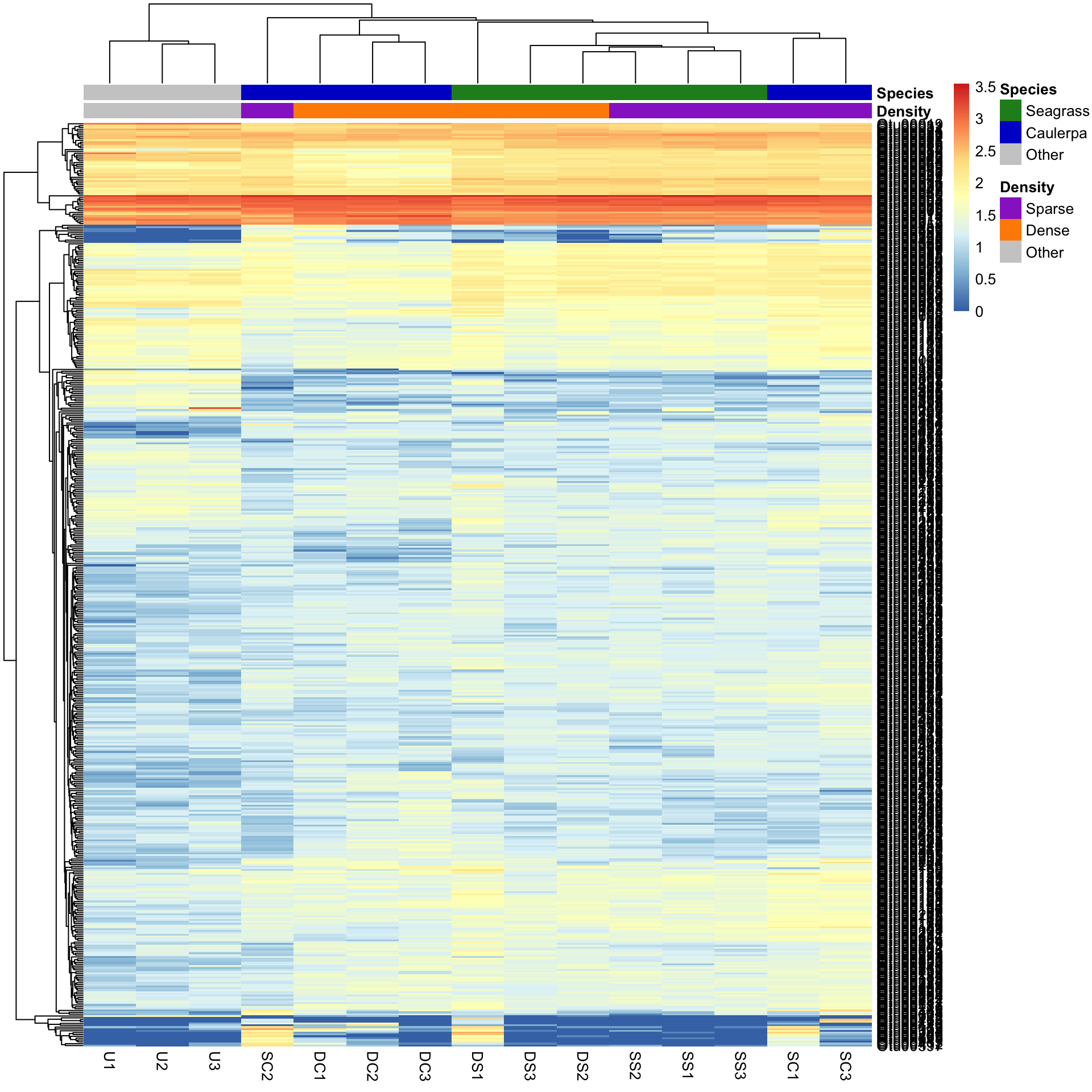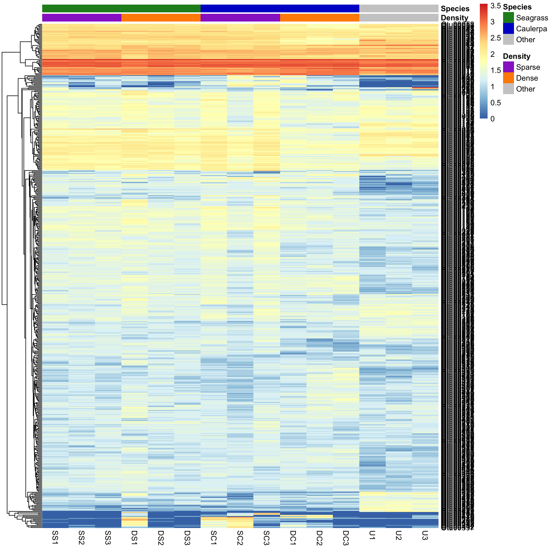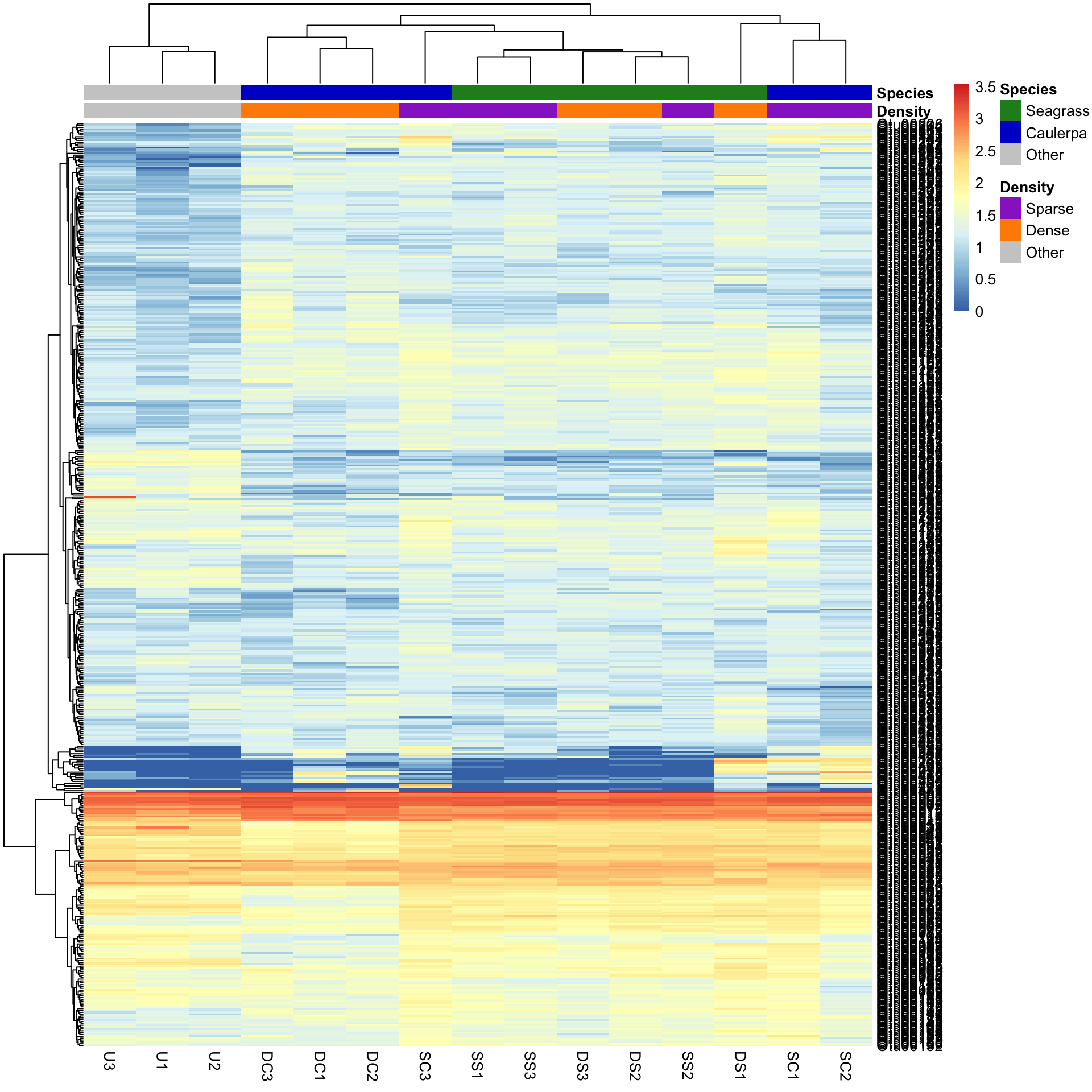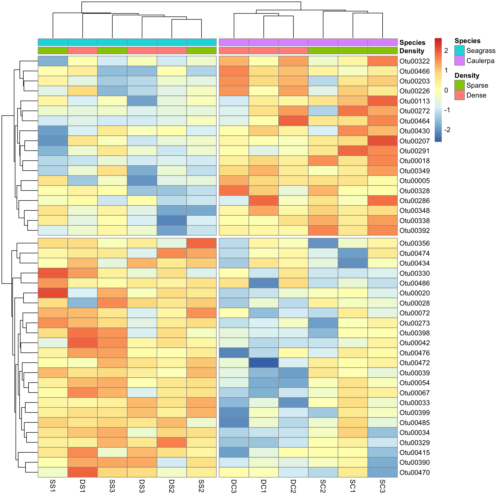 In this tutorial, we will use heatmaps to visualise patterns in the bacterial communities found within marine habitats in the presence of two macrophytes (seagrass and Caulerpa) at two densities (sparse and dense). There are also samples from unvegetated sediment (Other). There are three replicate samples in each group.