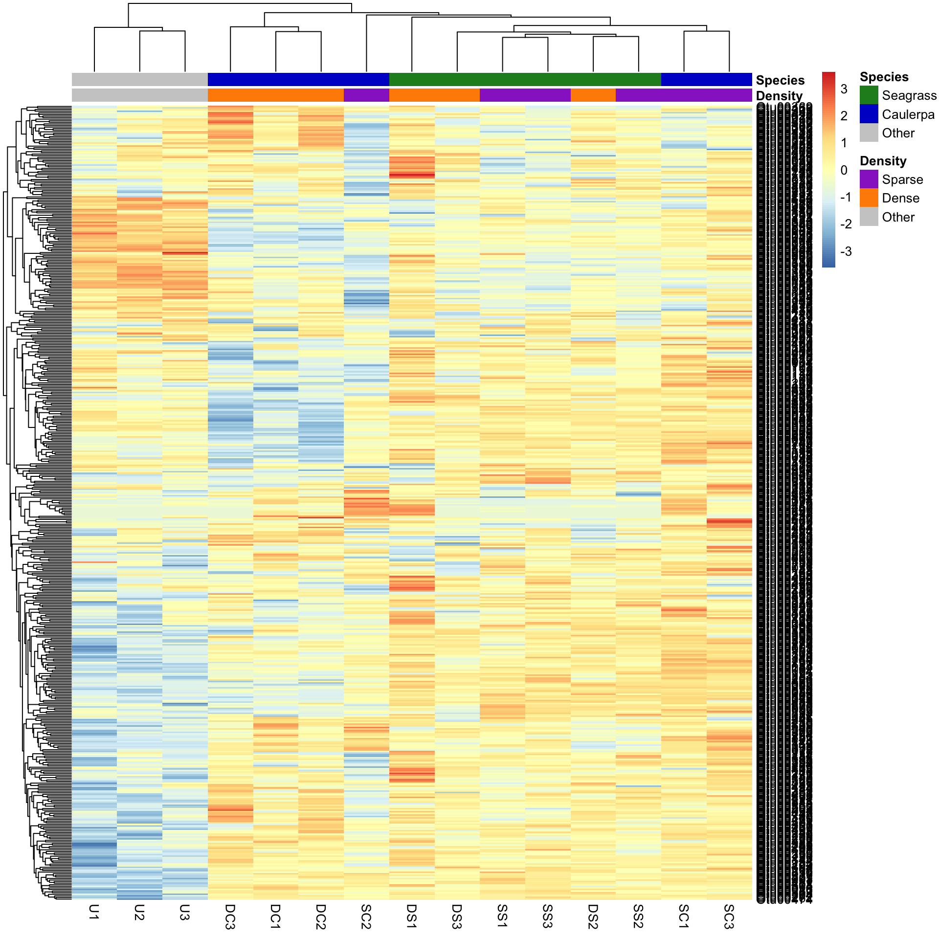 And the results are as expected. The top half of the heatmap shows those variables over-represented in the Species level Caulerpa. The bottom half are those over-represented in seagrass.