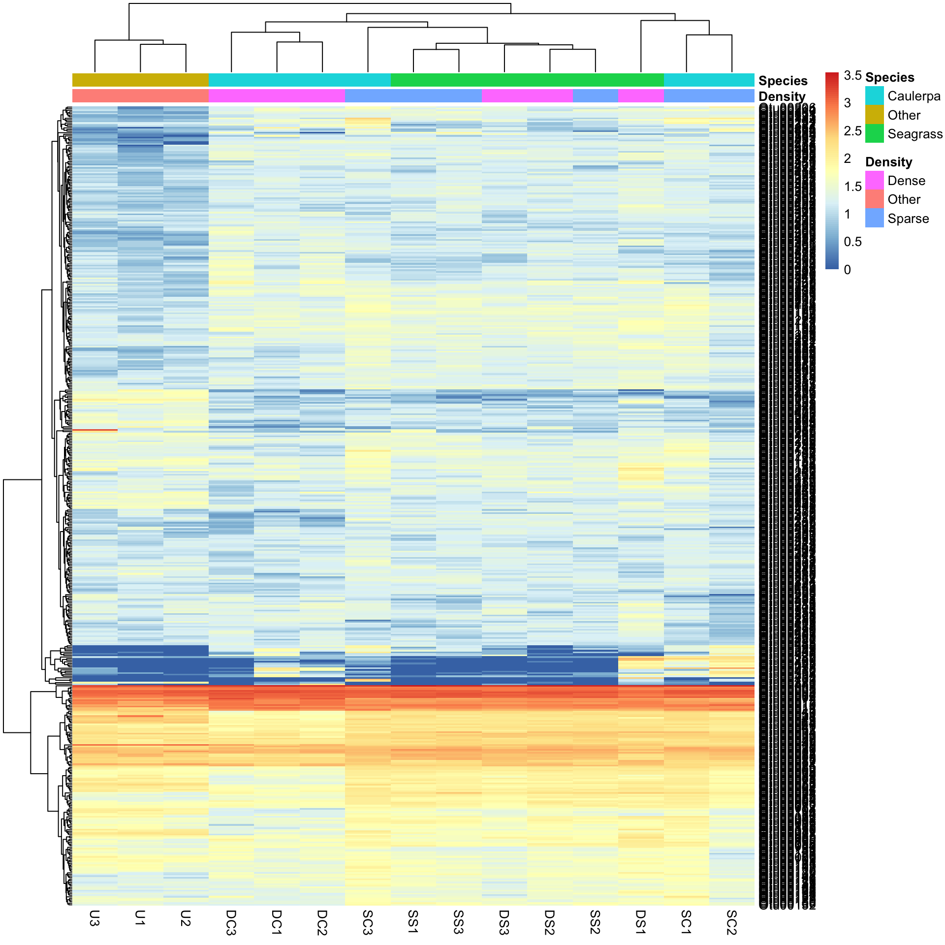 In this case, letting the data speak for itself (with default row and column clustering) shows that the unvegetated samples (Other) are dissimilar to the macrophyte samples (regardless of density) and that the seagrass samples generally cluster together. Note that other methods (e.g., ordination) can show sample to sample comparisons much better than heatmaps, but heatmaps reveal the patterns of the variables unlike those methods. Understanding what the data is doing is often overlooked in multivariate analysis.