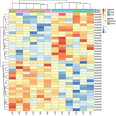 If we have analysed our multivariate data and identified those variables that differed between treatments, we can choose to plot only them in the heatmap. In this example, we will only look at those bacterial OTUs that differed between the two levels of the Species factor after removal of the unvegetated samples.