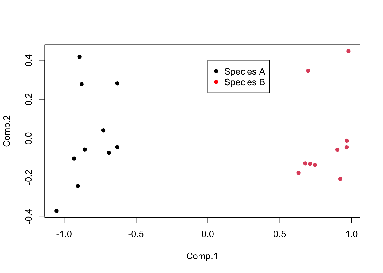 Calling the plot function on the scores of the princomp output produces a score plot. This is the ordination of all 20 leaf samples in the new two-dimensional space defined by PC1 and PC2. Here, we can also label the samples by species with the colour argument, and add a legend.