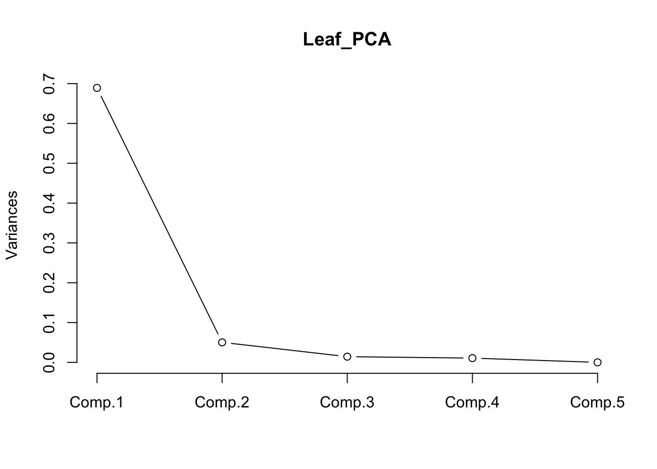 Leaf_PCA <- princomp(Leaf_data, cor = FALSE) # uses a covariance matrix