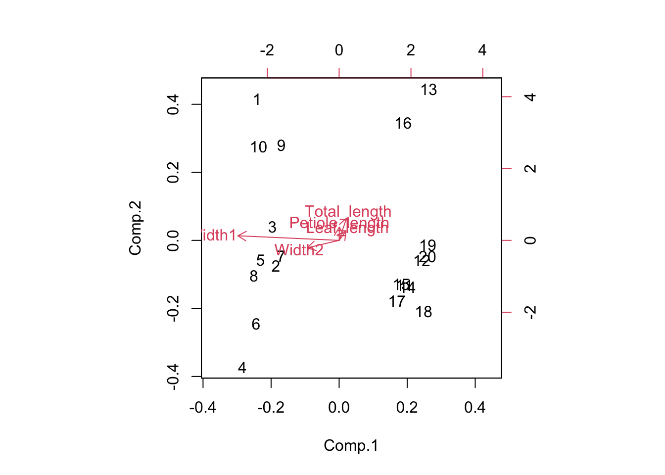 In this example, you can see that PC1 is positively correlated with the two width variables. R doesn’t bother printing very low correlations, so you can also see that PC1 is uncorrelated with the three length variables. Given the the two species are split along the x-axis in the score plot (PC1), we now know that species A with high values of PC1 has wider leaves than species B with low values of PC1. We also know that leaves toward the top of the plot are the longest due to the positive correlations between PC2 and the three length variables (but this does not separate the two species on the plot).