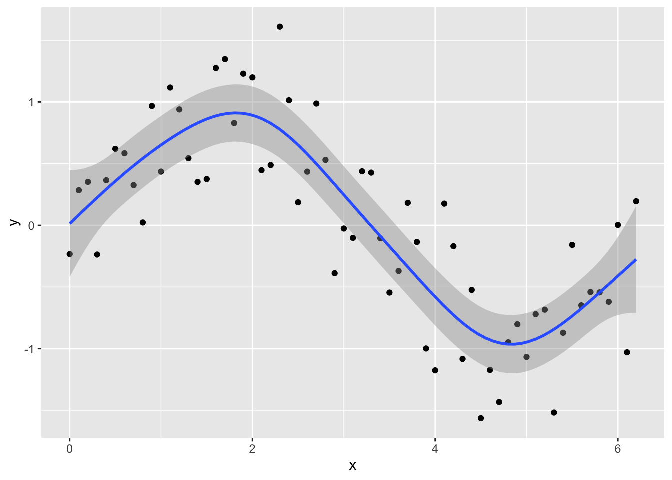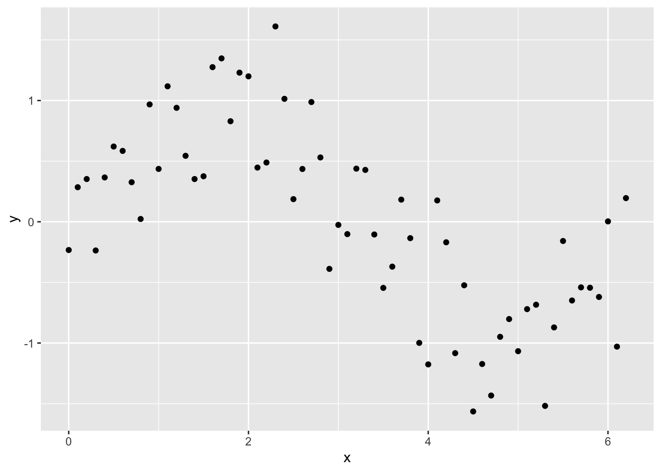 y <- sin_x + rnorm(n = length(x), mean = 0, sd = sd(sin_x / 2))