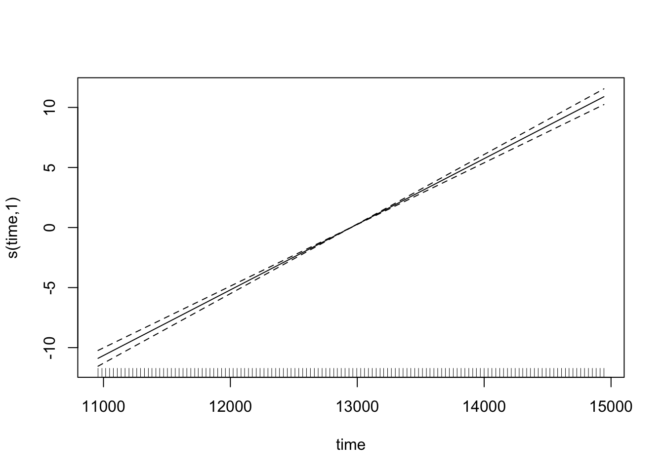 OK, so let’s plot it and look at a smooth term for time. \[y = \beta_0 + f_{\mathrm{trend}}(time) + \varepsilon, \quad \varepsilon \sim N(0, \sigma^2)\]