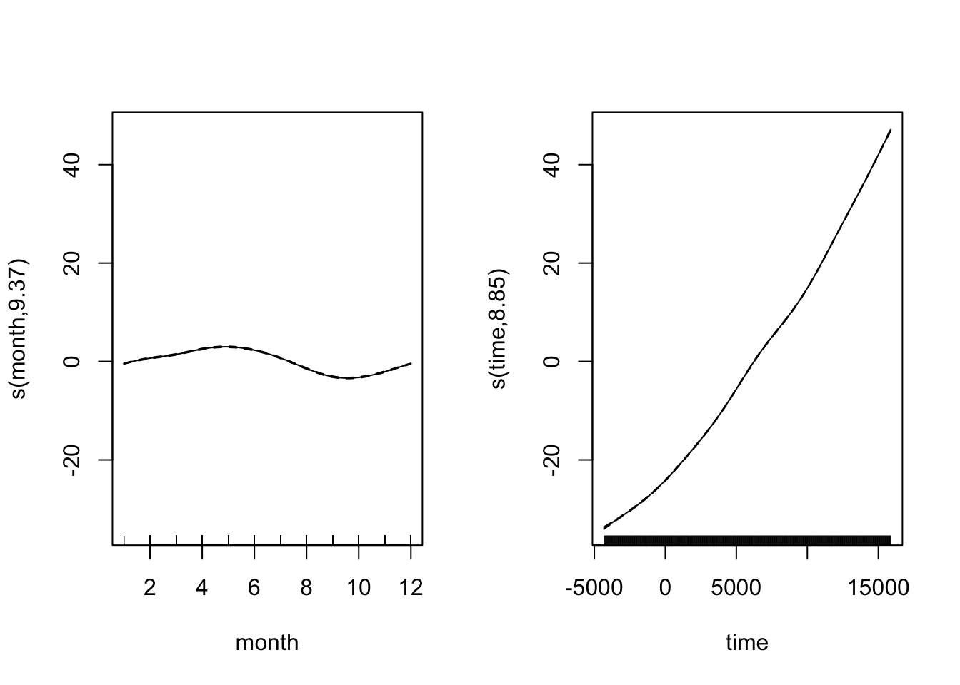 CO2_season_time <- gam(co2 ~ s(month, bs = "cc", k = 12) + s(time), data = CO2_dat, method = "REML")