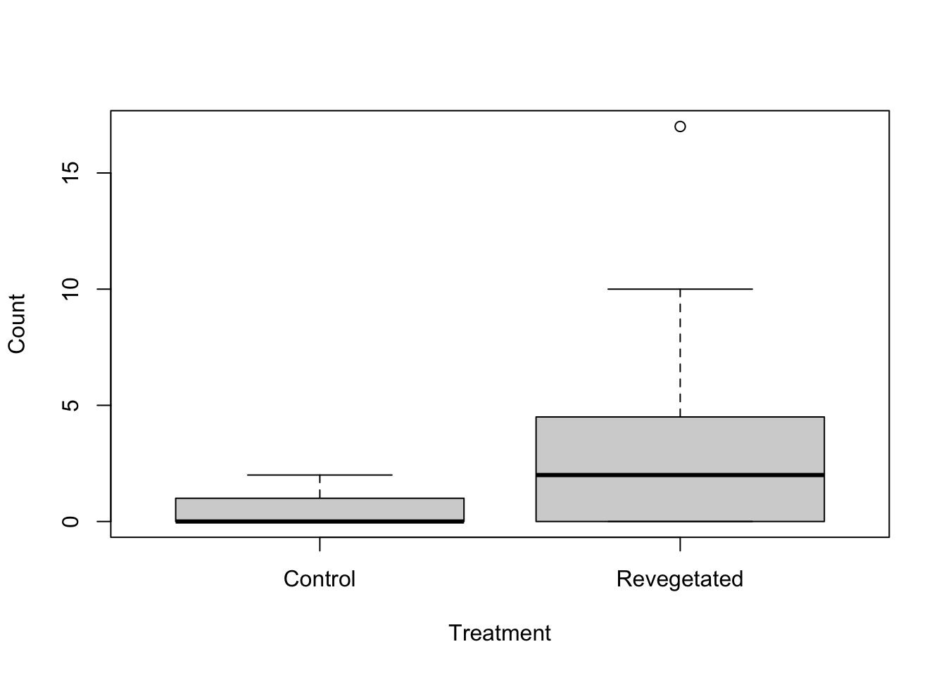 boxplot(Soleolifera ~ Treatment, ylab = "Count", xlab = "Treatment", data = Reveg)