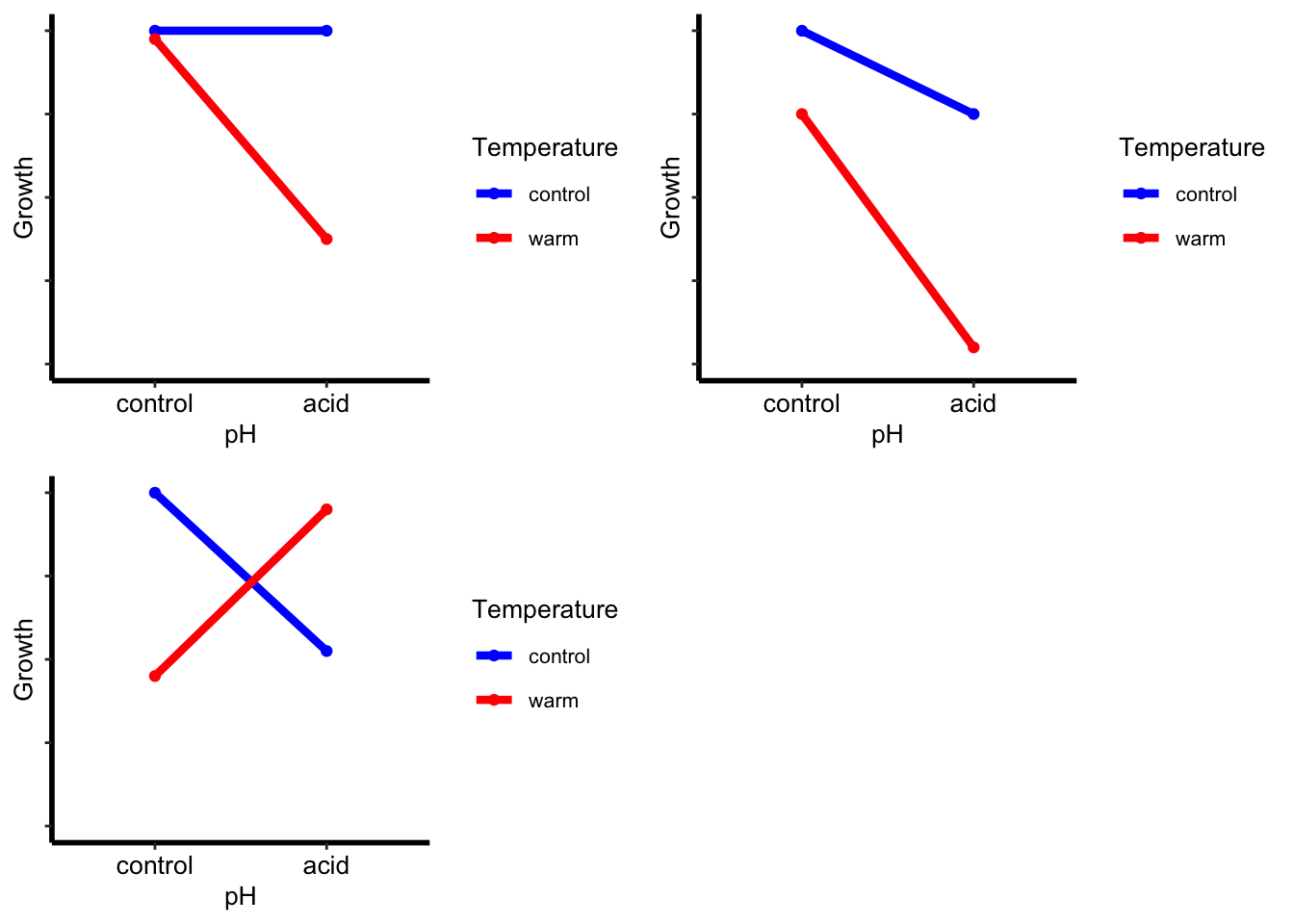 In designs with categorical factors, post-hoc tests are commonly used to test which means differ from which (i.e., compare all four combinations of temperature and pH in the design above). The results from these can be placed in the text or onto figures to show which means differ from which. You would then have statistical support for statements that contrast particular treatments. A sentence for the results section for the top left figure in the interactions plots above would be something like “Temperature interacted with pH to affect the growth of corals (Table 1), with reduced growth in the warm treatment only (Fig. 1)” where Table 1 would hold the statistical details of the given test (e.g., factorial ANOVA).