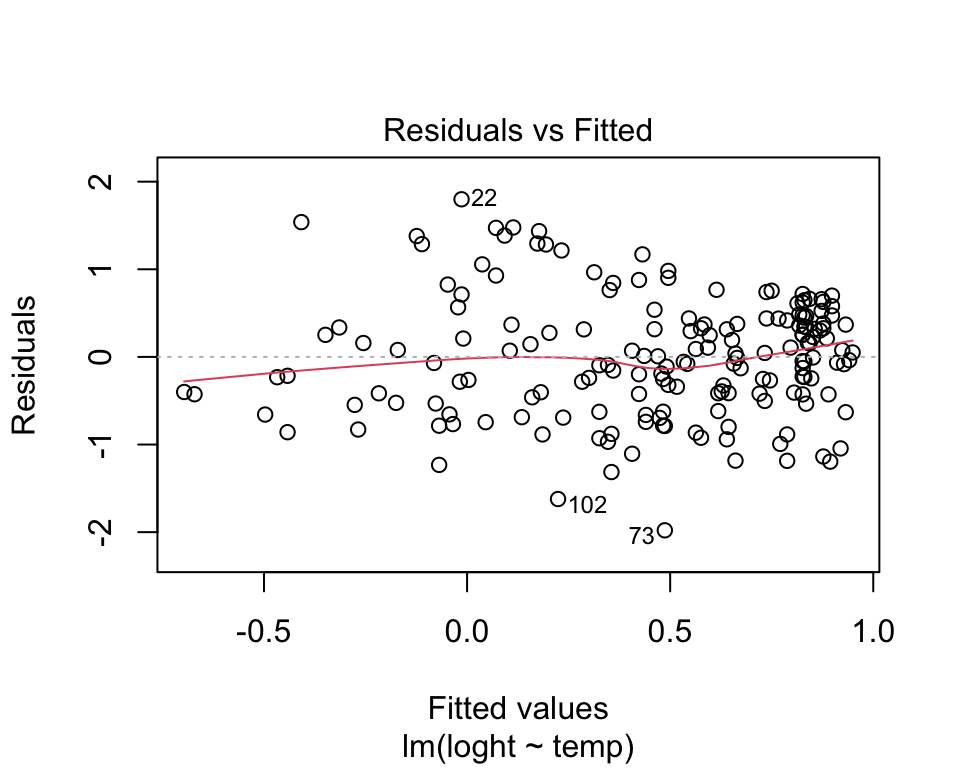 Linearity. There is no point trying to fit a staight line to data that are curved! Curvilinear relationships produce U-shaped patterns in plots of the residuals vs the fitted values. Using the plot function on a model object provides a series of four graphical model diagnostics, the first of which is a plot of residuals versus fitted values.