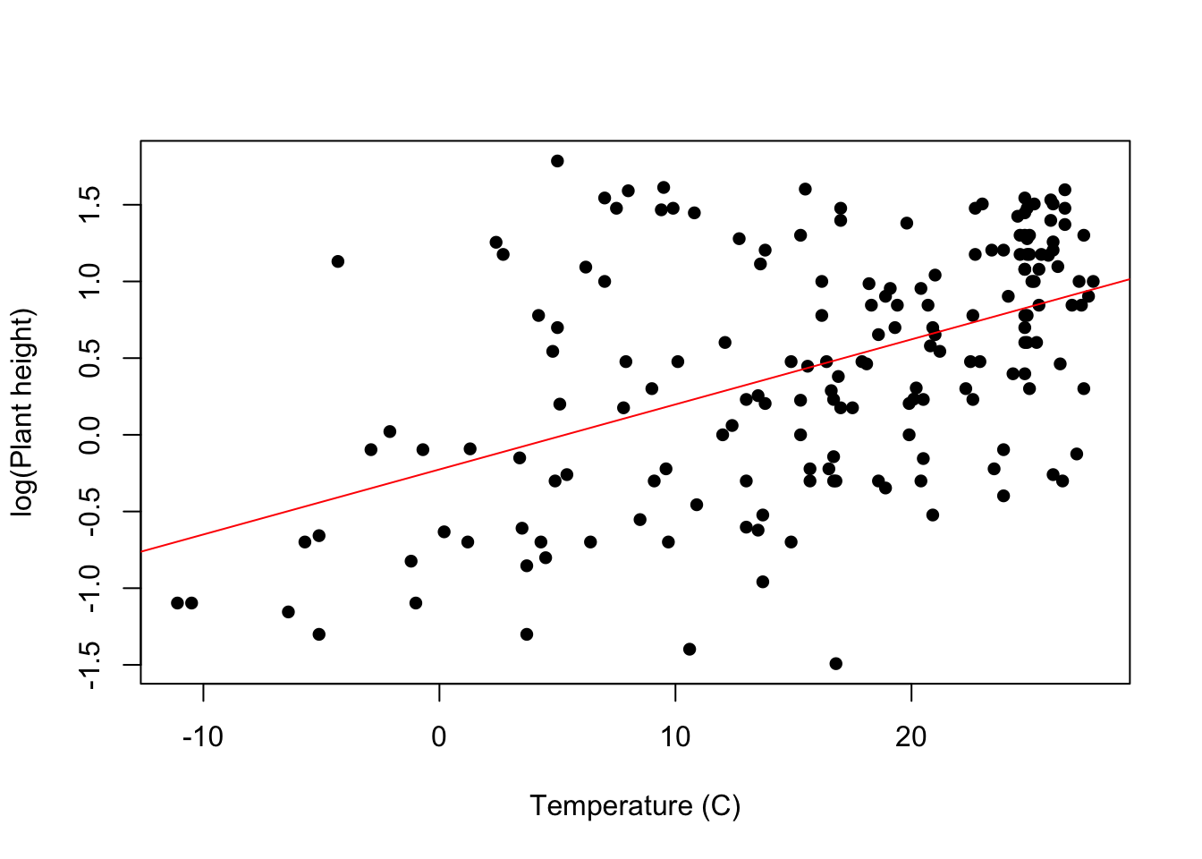 \[log(plant height) = -0.22566 +0.0421.temperature + \varepsilon \]