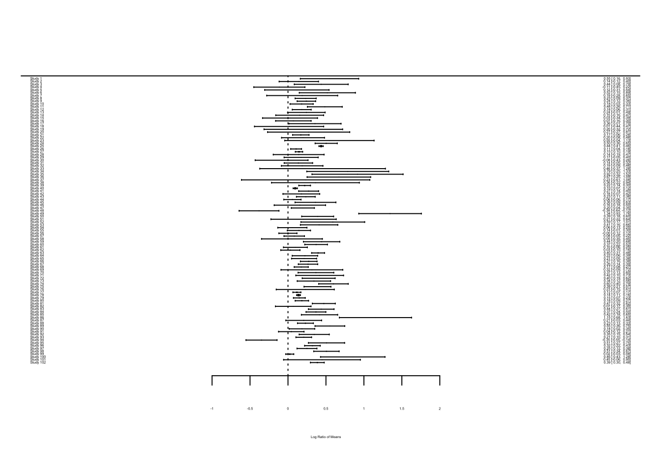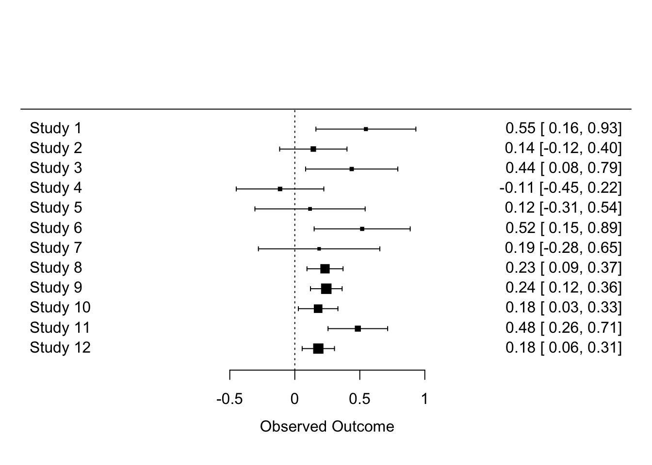 The problem you see is that when there are many studies, a forest plot does not really work (unless you have very large screen!). Let’s look at just the first 12 studies.