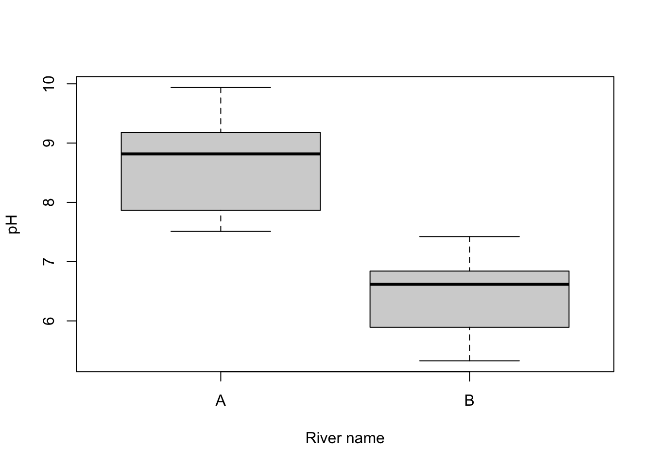 boxplot(pH ~ River_name, data = River_pH, xlab = "River name", ylab = "pH")