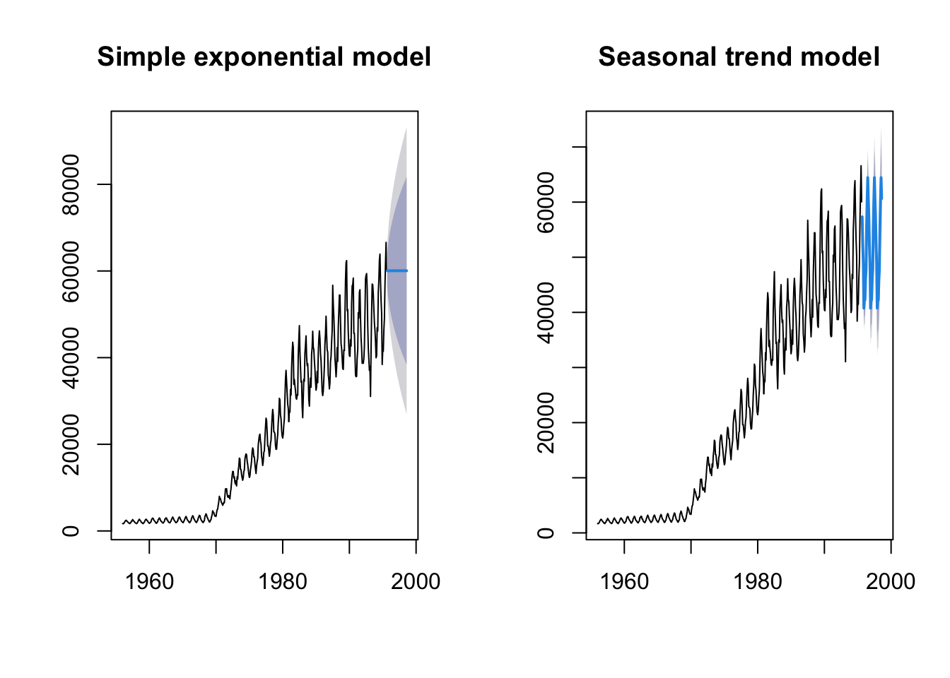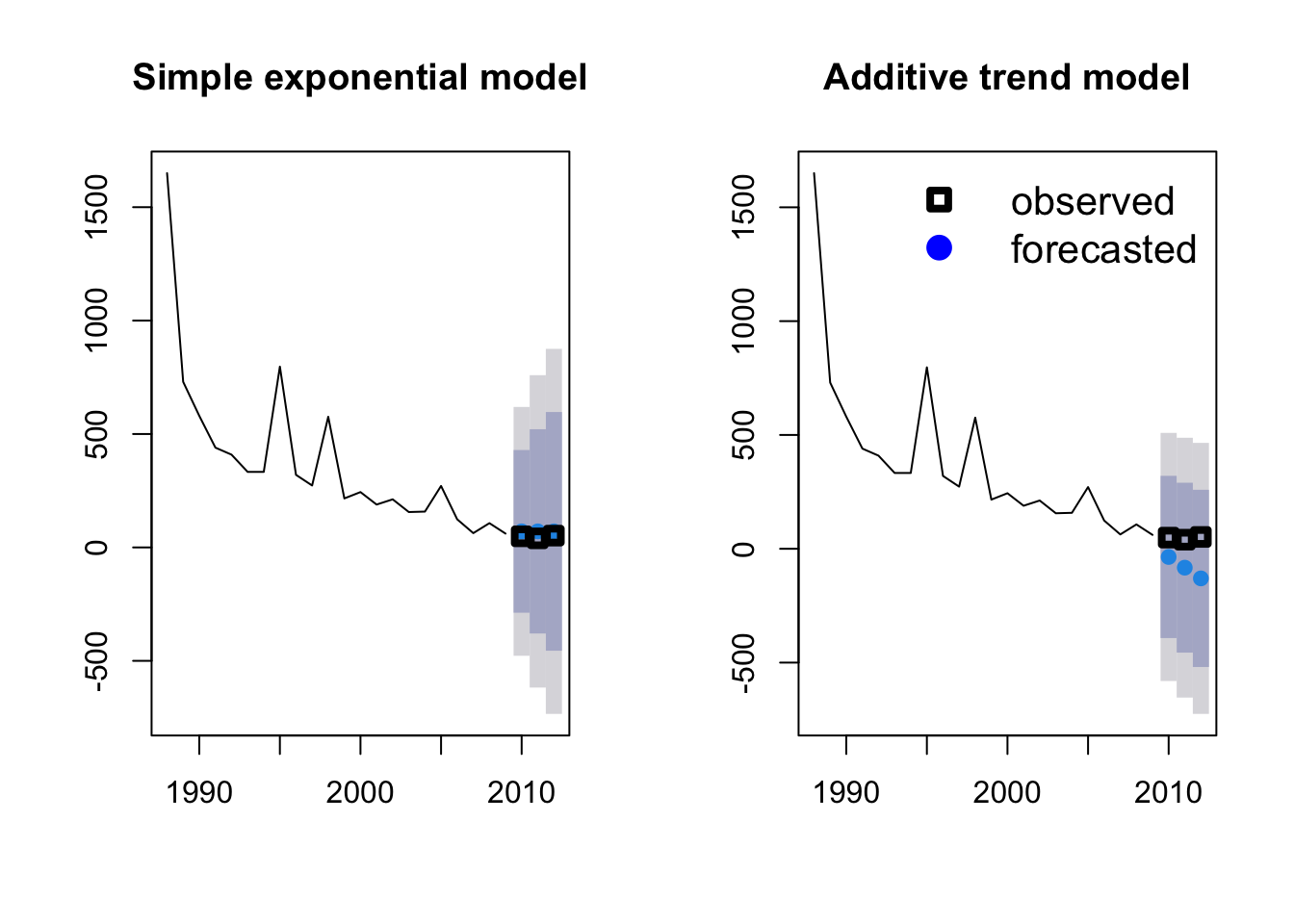 We can compare the simple exponential model with the model incorporating the additive trend by plotting them side by side.