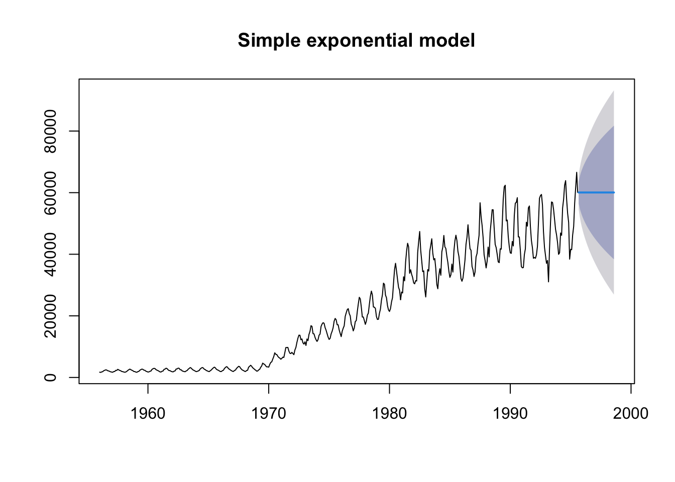 If we use our first model, the simple exponential model that doesn’t assume a trend or seasonality (ANN), we get the following when we are predicting the next 3 years. Note that h is now 36 time points (= 3 years x 12 months).