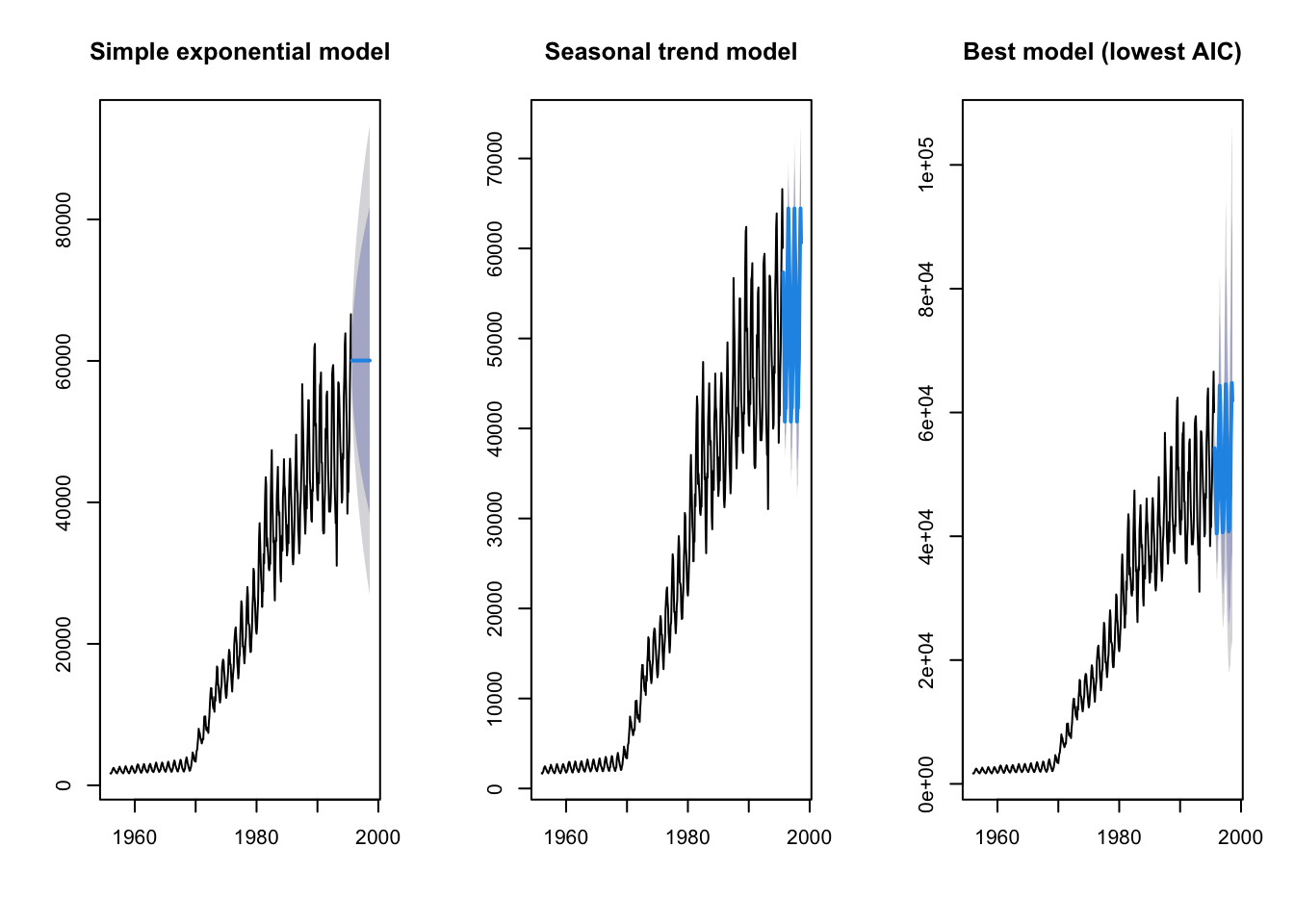 Which model do you think performs better? Another option is to fit all possible models and select the best model using AIC. This is done simply by not specifying any model structure in the ets command.