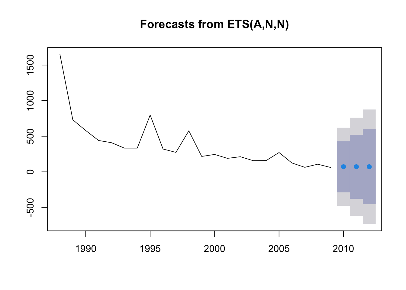 In the ets function, the model type is expressed as a three-character code representing the error type (first character), the trend type (second character) and the season type (third character). We will use the model type = ANN which is a simple exponential smoothing model with additive errors (A), no assumed trend (N) and no seasonality (N).
