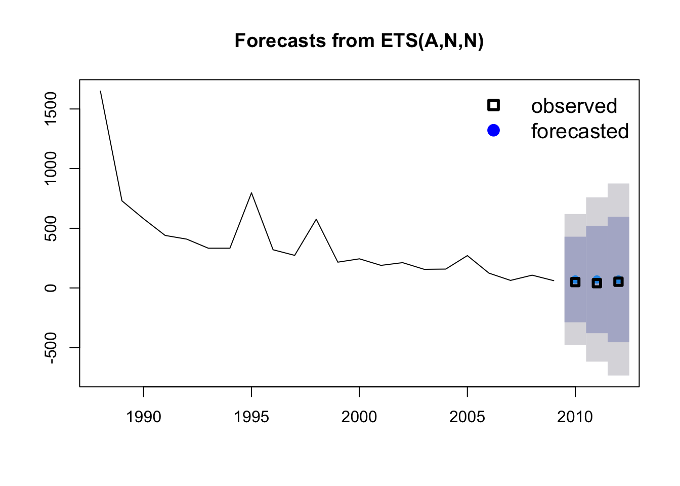 The output of our forecast gives us the forecasted values (Forecast) for each year (Point) and then the 80% and 95% confidence intervals. How did we do? By using the plot function on a forecast object, we can see a plot of the historical trend (line), with our forecast observations (blue points) and our confidence intervales (95% - grey shading, 80% - blue shading).